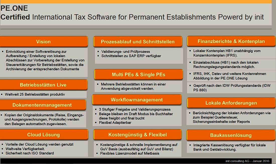 Gemeinsam mit der Siemens AG hat die init Consulting AG mit Sitz in Ingolstadt eine Softwarelösung auf Basis des AOA (Authorized OECD Approach)  & des BsGaV für deren Betriebsstätten entwickelt. Die Lösung beinhaltet alle steuerrechtlich relevanten Anforderungen um einen Steuerabschluss der Betriebsstätte kostengünstig & schnell abwickeln zu können.